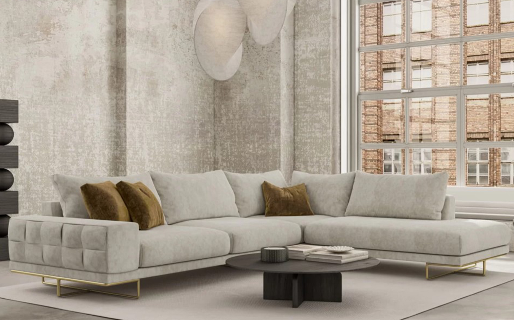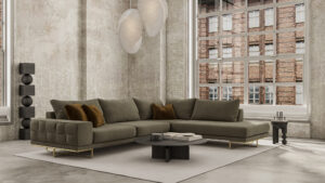 Γωνιακός καναπές με μεταλλική βάση που μπορεί να παραχθεί και σε μαύρο χρώμα αλλά και ιδιαίτερη τεχνοτροπία στο μπράτσο του.