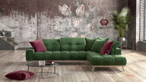 Ένας καναπές με ανακλήσεις στα μαξιλάρια της πλάτης του και λεπτομέρειες από ξύλο και ραψίματα που ξεχωρίζει και δεσπόζει σε οποιονδήποτε χώρο!