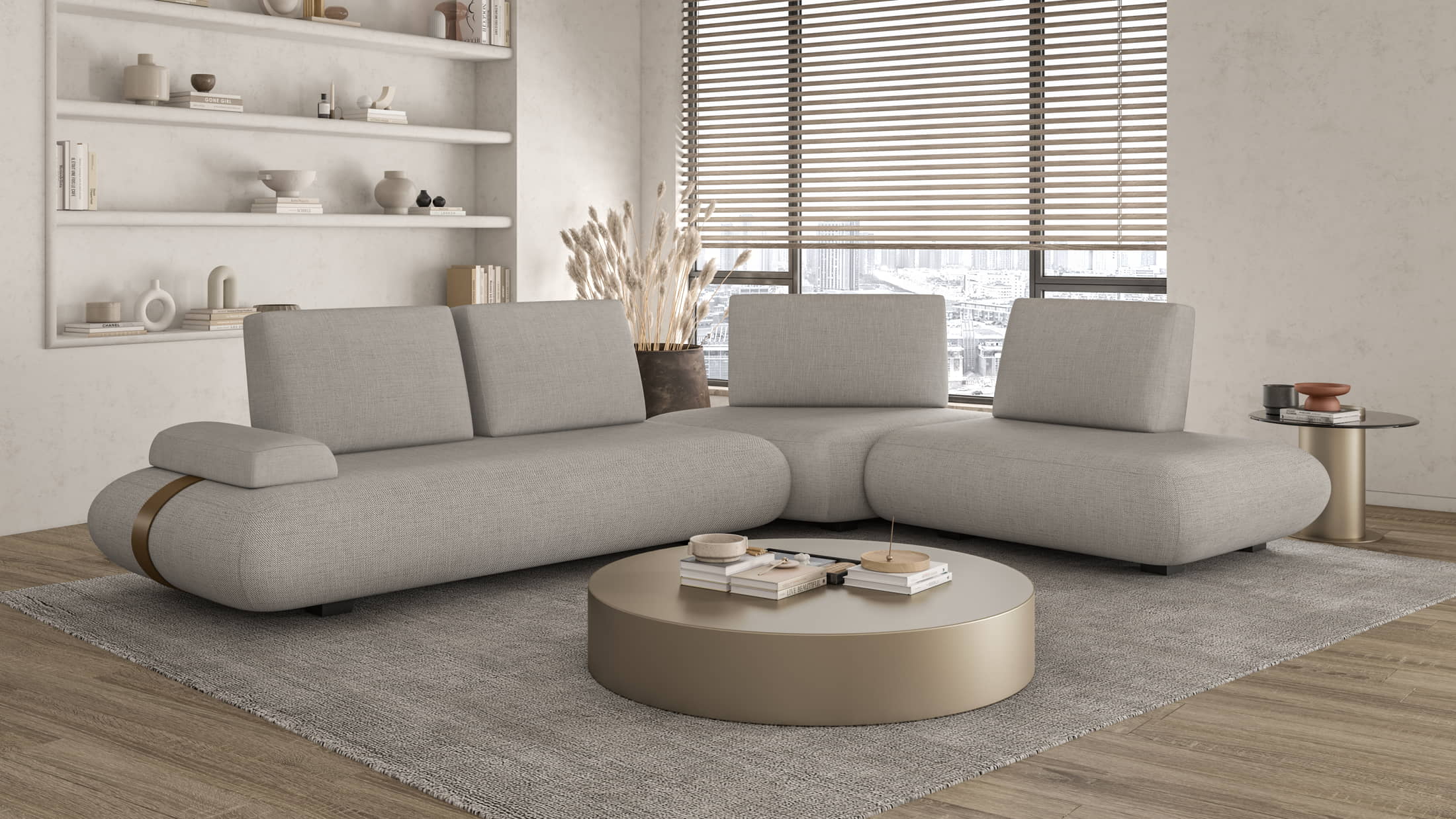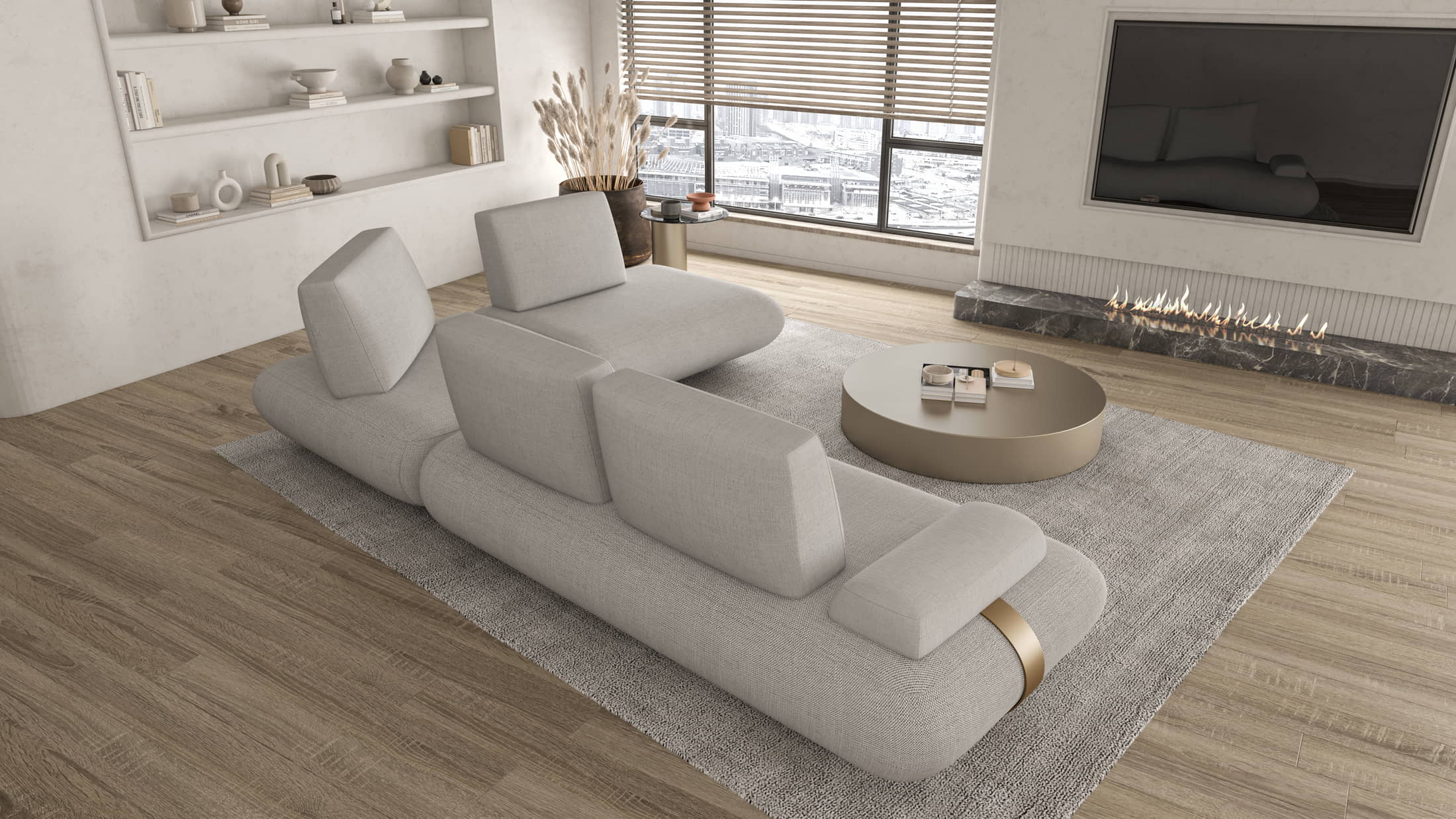 Γωνία σε σχήμα βότσαλου, σε minimal γραμμές που δίνει μια ιδιαίτερη αίσθηση στον χώρο. Αποτελείται από 3 τεμάχια εξωτερικών διαστάσεων 310 x 255 cm.