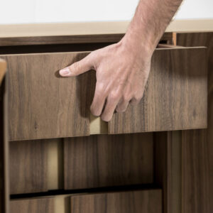 Η Ιαπωνική αισθητική φλερτάρει με την Μεσογειακή επιδεξιότητα σε αυτό το μοναδικό έπιπλο. Ο μπουφές Om χαρακτηρίζεται από τον ξεκάθαρο σχεδιασμό του και αποπνέει δυναμισμό τόσο μέσα από τις minimal γραμμές του, όσο και από τα υλικά του. Το γραμμικό μεταλλικό πλαίσιο αναδεικνύει κατάλληλα τον ανθεκτικό και καθόλα λειτουργικο μπουφέ. Ταυτόχρονα, οι γλυκές γήινες αποχρώσεις του ξύλου δημιουργούν μία δυναμική αντίθεση με το μεταλλικό πλαίσιο, δημιουργώντας μία εξαιρετική ενέργεια για κάθε χώρο.