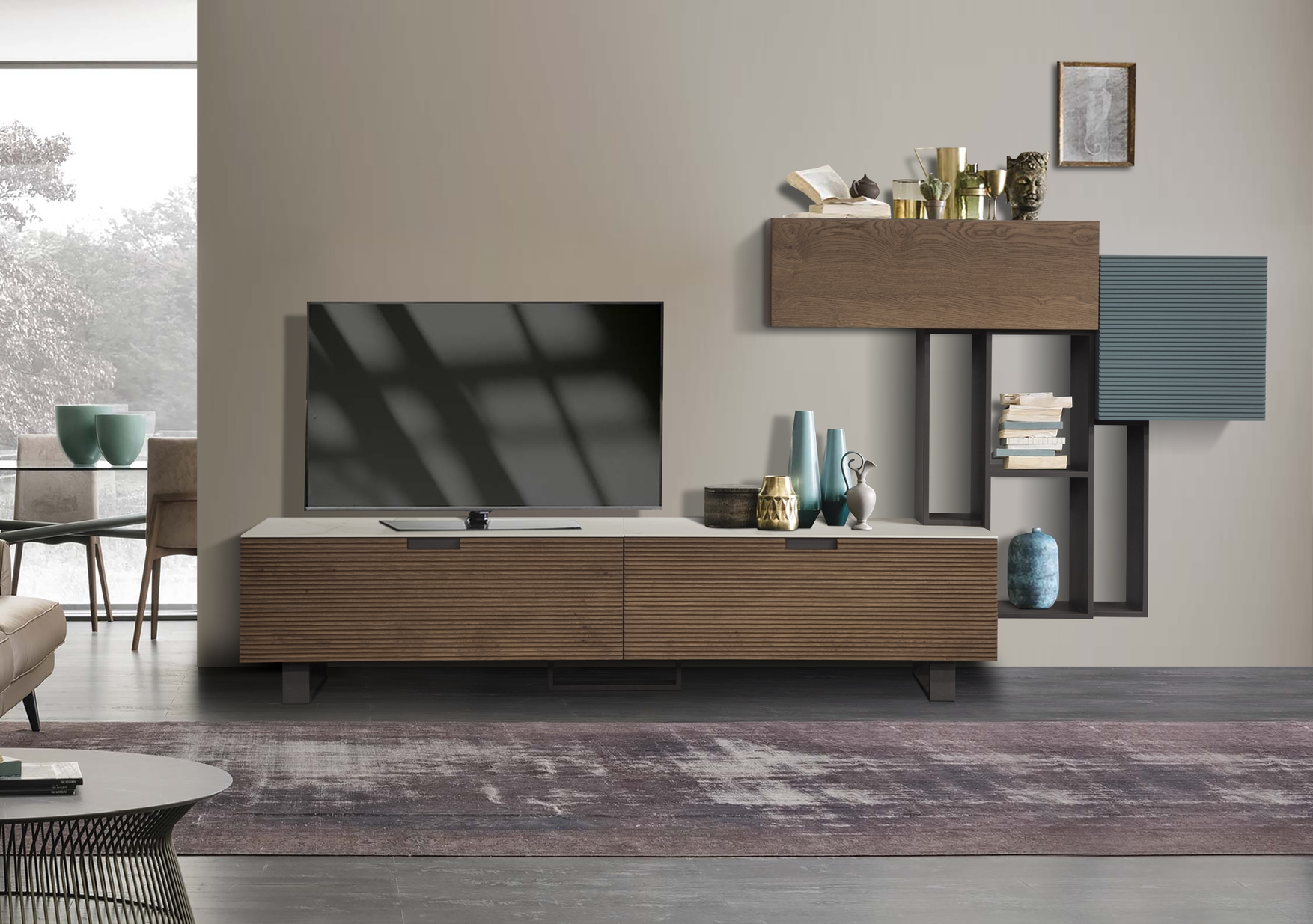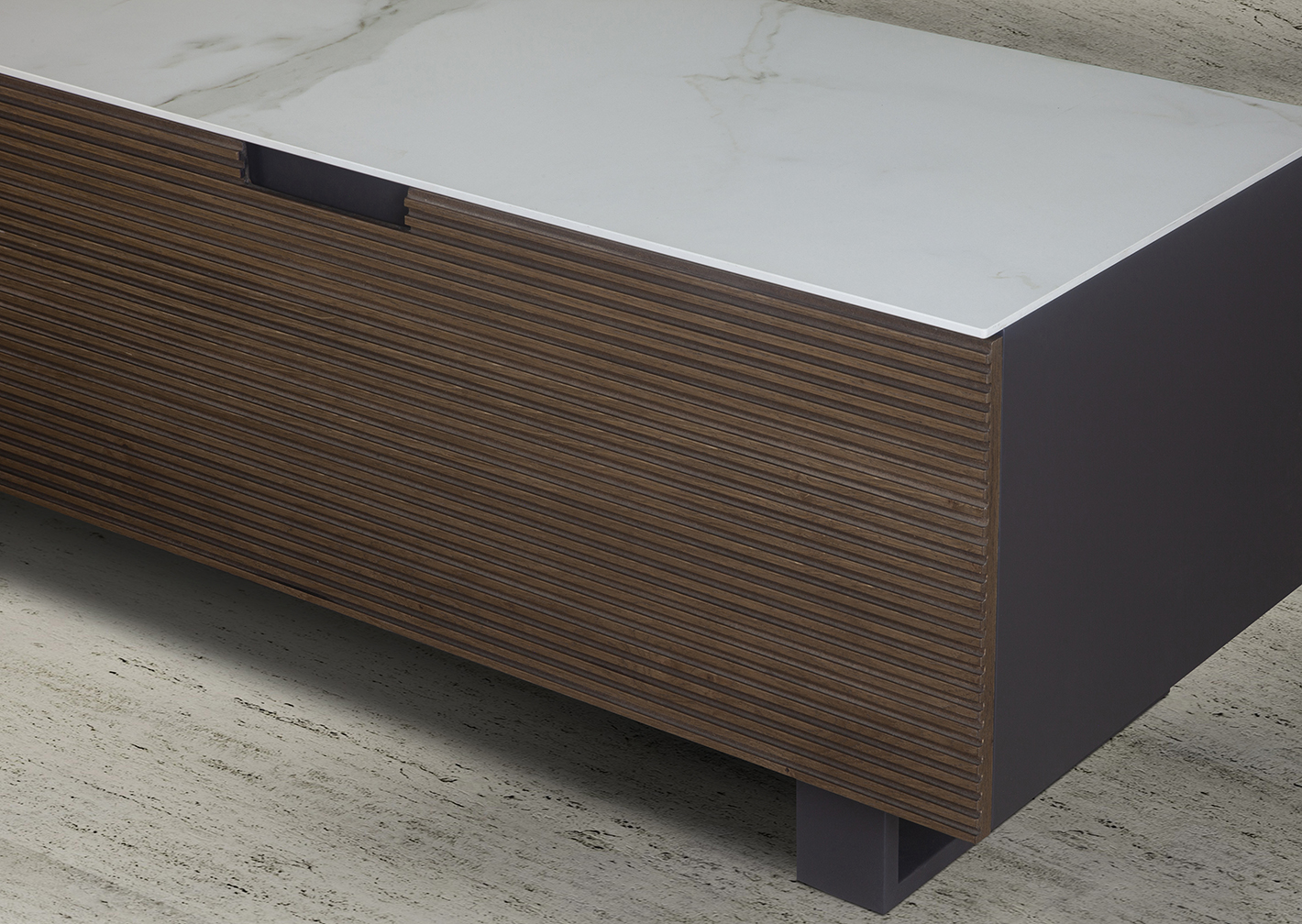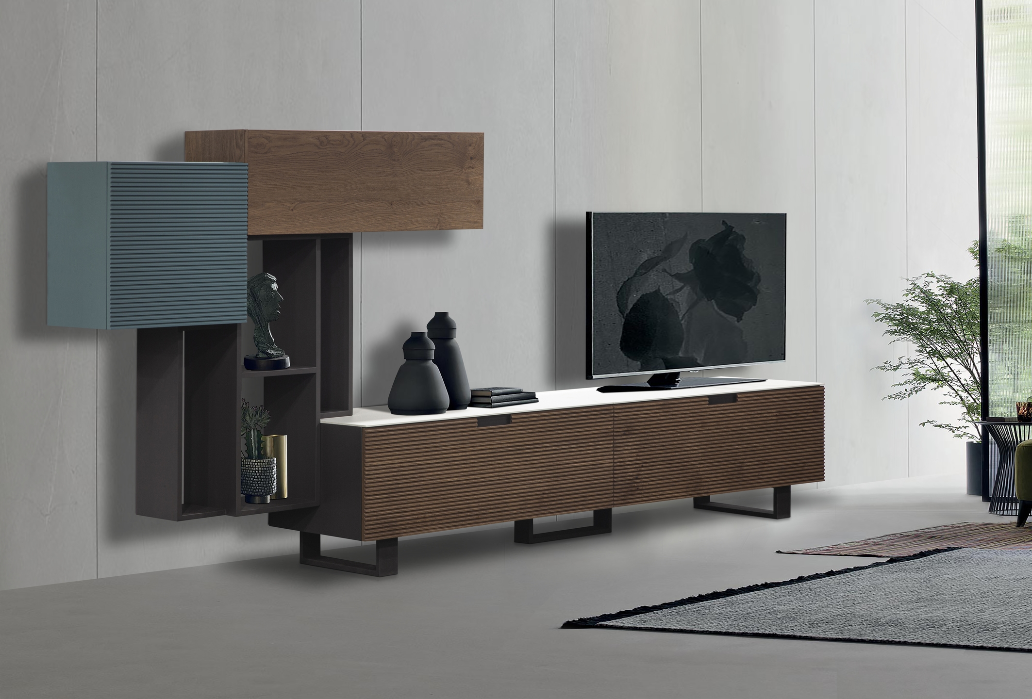 Η σύνθεση Scratch είναι ένα ιδιαίτερο έπιπλο τηλεόρασης με χαμηλό ύψος και υλικά υψηλής ποιότητας που εντυπωσιάζουν! Κεραμικό, ξύλο δρυς και γκοφρέ λάκα συνδυάζονται με ένα αποτέλεσμα ιδιαίτερα φινιρισμένο!