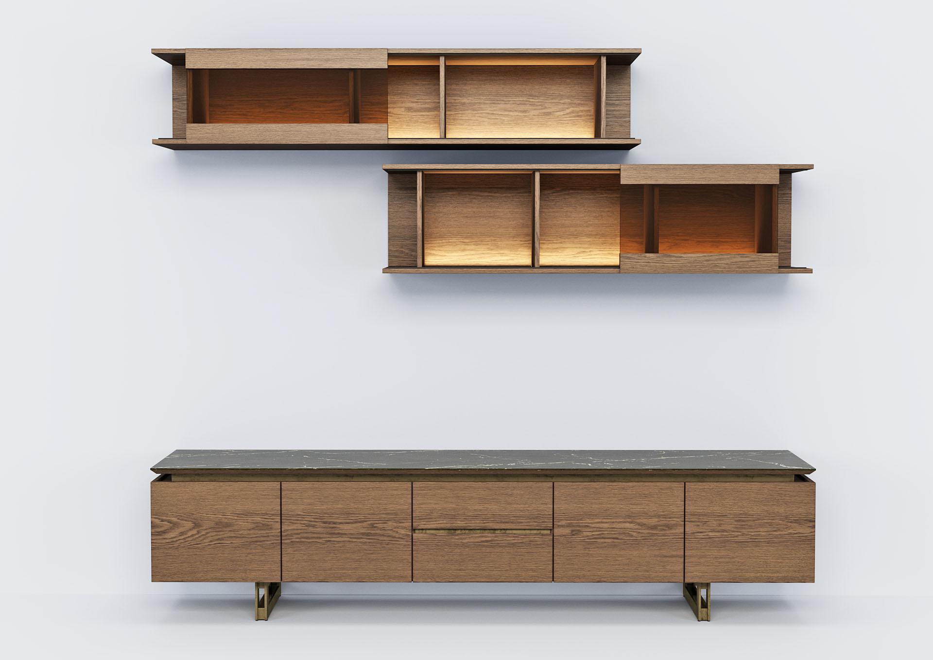Σύνθεση κατασκευασμένη από ξύλο δρυός και μασίφ δρύινες λεπτομέρειες. Η μαύρη κεραμική επιφάνεια στο καπάκι του ολοκληρώνει την άψογη αισθητική του. Το καπάκι μπορεί να παραμείνει δρύινο για τους λάτρεις του ξύλου. Οι πόρτες λειτουργούν με μηχανισμούς soft-close για αθόρυβη χρήση. Παράγεται σε ποικιλία διαστάσεων, αποχρώσεων ξύλου και κεραμικού.